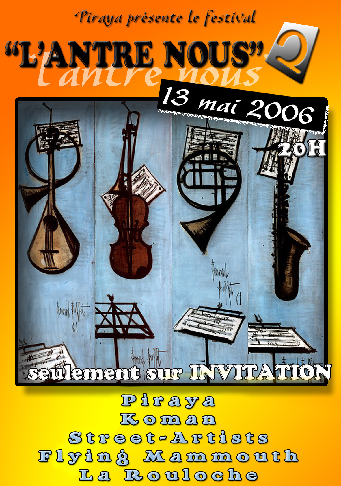| > | L'Antre Nous Le 13 mai 2006 Un petit festival entre amis. Pleins de sons différents, une très bonne ambiance, tout ça dans un cadre idilique. [Voir les photos] Autres groupes : La Rouloche (chanson), Street Artist (rap), Piraya (rock festif- raggae, dub), Flying Mammouth (fusion). |